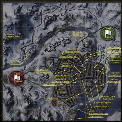 1) Всего на карте Виндсторм было использовано более двух десятков названий. Большая их часть пришлась на городскую часть карты, что естественно - город наиболее сложен для ориентирования и наличие развитой топонимики просто необходимо, если город на игровой локации имеет больше трёх улиц и переулков. К примеру, на Руинберге и линии Зигфрида не помешало бы ввести названия улиц и перекрёстков.